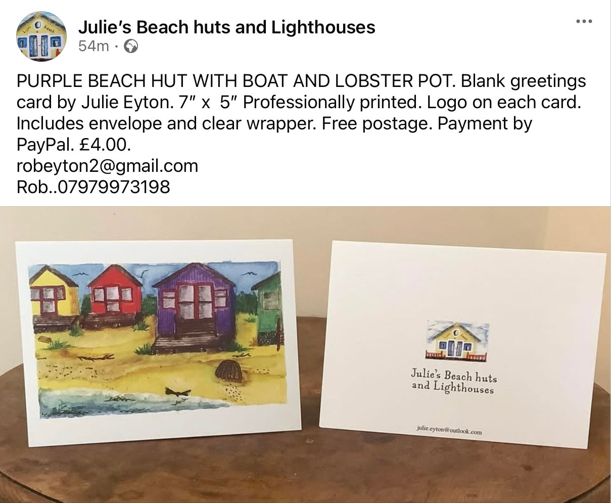 PURPLE BEACH HUT WITH BOAT AND LOBSTER POT. Greetings card. 5” x 7”. From original watercolour paintings by the artist Julie Eyton.